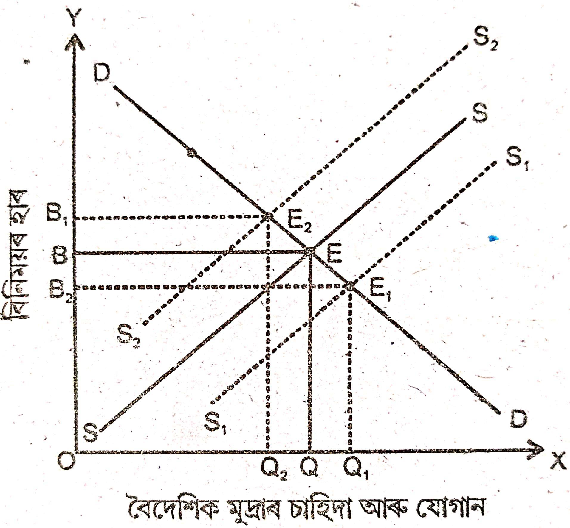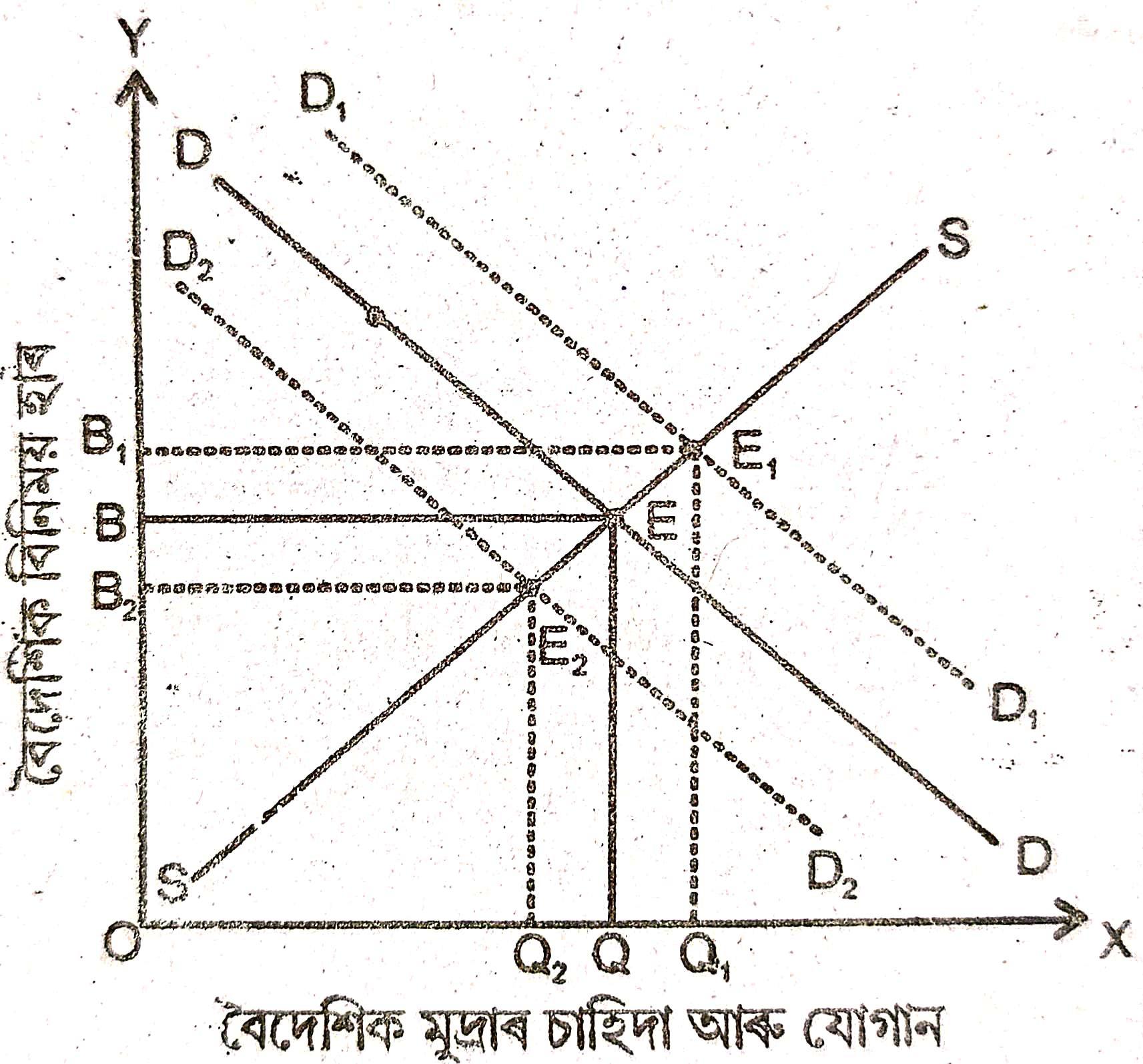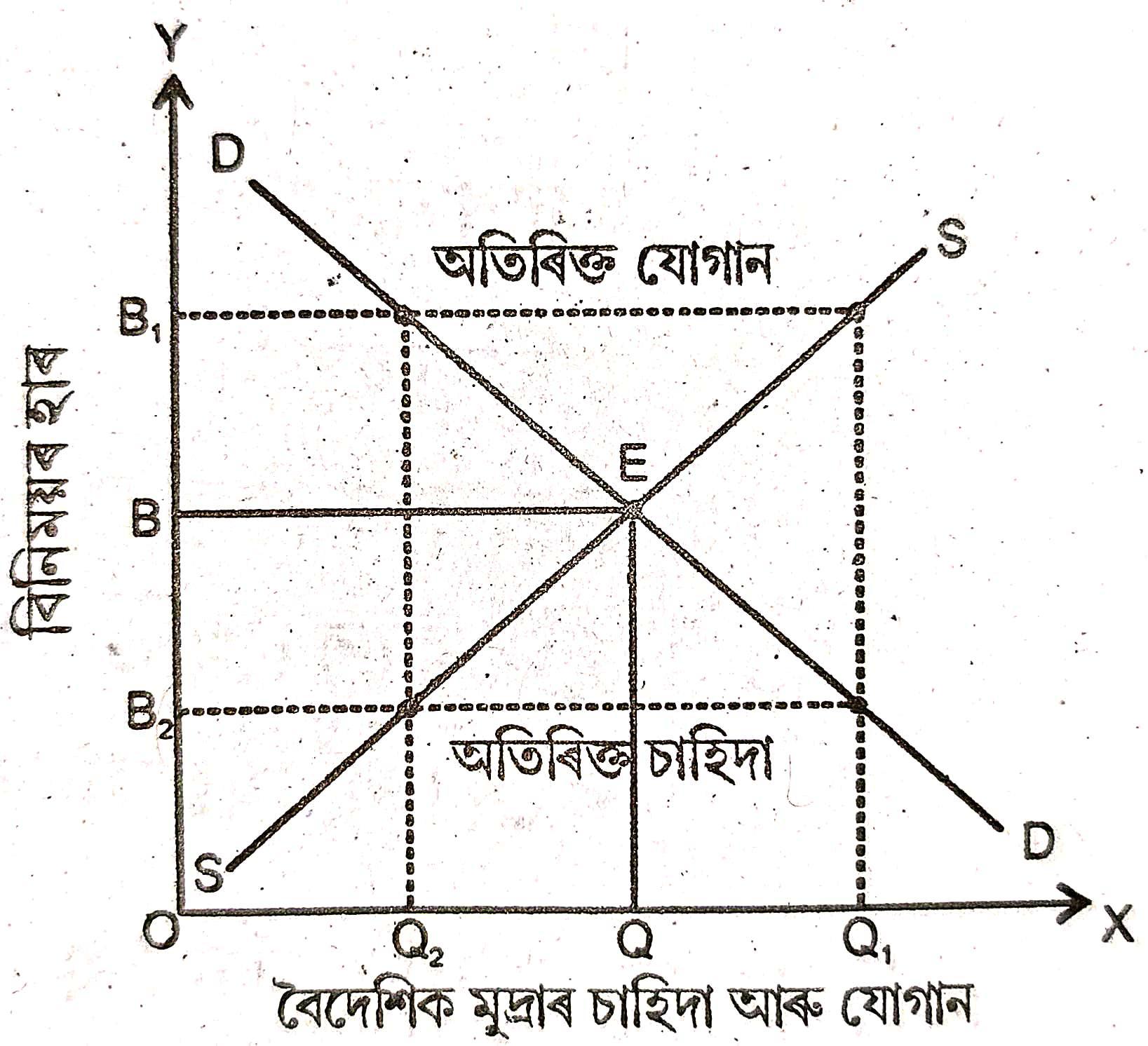 আকৌ, যদি বিনিময় হাৰ OB লৈ হ্রাস পায়, তেন্তে বৈদেশিক মুদ্রাৰ চাহিদা OQ₁ লৈ বৃদ্ধি হ’ব আৰু যোগান OQ₂ লৈ হ্রাস পাব। এয়া হৈছে অতিৰিক্ত চাহিদাৰ পৰিস্থিতি। ইয়াৰ ফলস্বৰূপে বিনিময় হাৰ বৃদ্ধি পাব। OB ভাৰসাম্য স্তৰত উপনীত হোৱালৈ এই বৃদ্ধি অব্যাহত থাকিব।